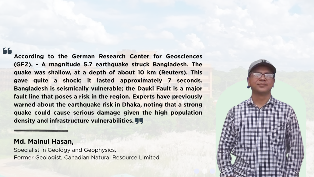Dr. Md. Zillur RahmanEarthquake Specialist & Professor,Department of Disaster Science and Climate Resilience,University of Dhaka Dr. Md. Zillur Rahman stated—“According to the Bangladesh Meteorological Department, the epicenter of today’s earthquake was in Madhabdi of Narsingdi, and its magnitude was 5.7 on the Richter scale. As geologists, we try to identify whether there is any fault […]